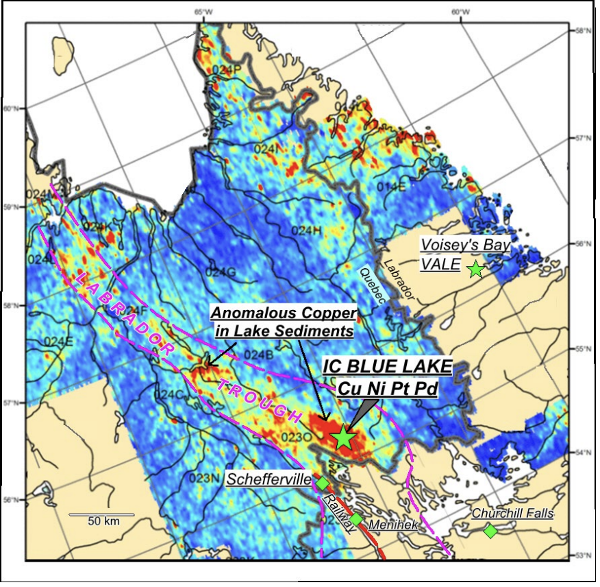 The new claims were staked to cover land contiguous to and on strike with Cu Ni Pt Pd deposits and showings previously outlined within our project area and centered on a major regional copper in lake sediments anomaly. This large anomaly shown in red, Figure 1 below, is based on 26,727 lake sediment samples from Northern Quebec and 2,484 samples from Labrador (SC Open File 7946, McCurdy et al, 2015). The +200 pm copper contour, see Figure 2 below, covers an impressive area of more than 800 sq km. The magnitude and area of this anomaly suggests that there are potentially multiple sources of copper and related metals mineralization yet to be discovered, both of high-grade massive sulfide, and disseminated low grade high tonnage types.