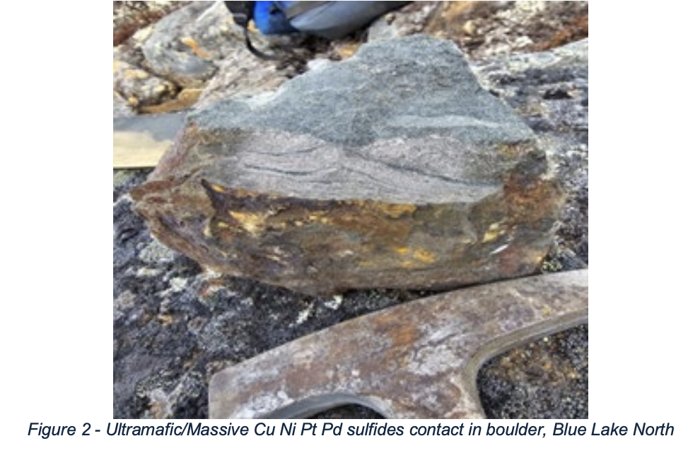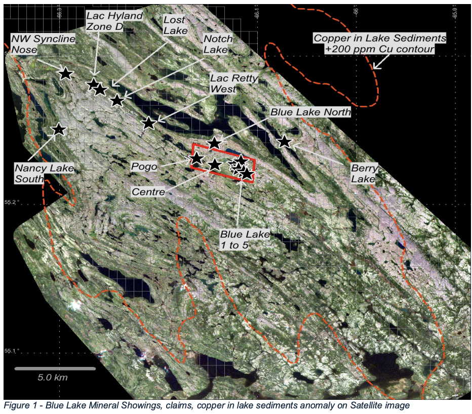 Mike Muggridge. P.Geo (NL), based on the assay results from 72 grab samples of rusty boulders, outcrop, massive sulfide mineralization from multiple widespread showings, and from the Blue Lake Adit stockpile, noted the following: